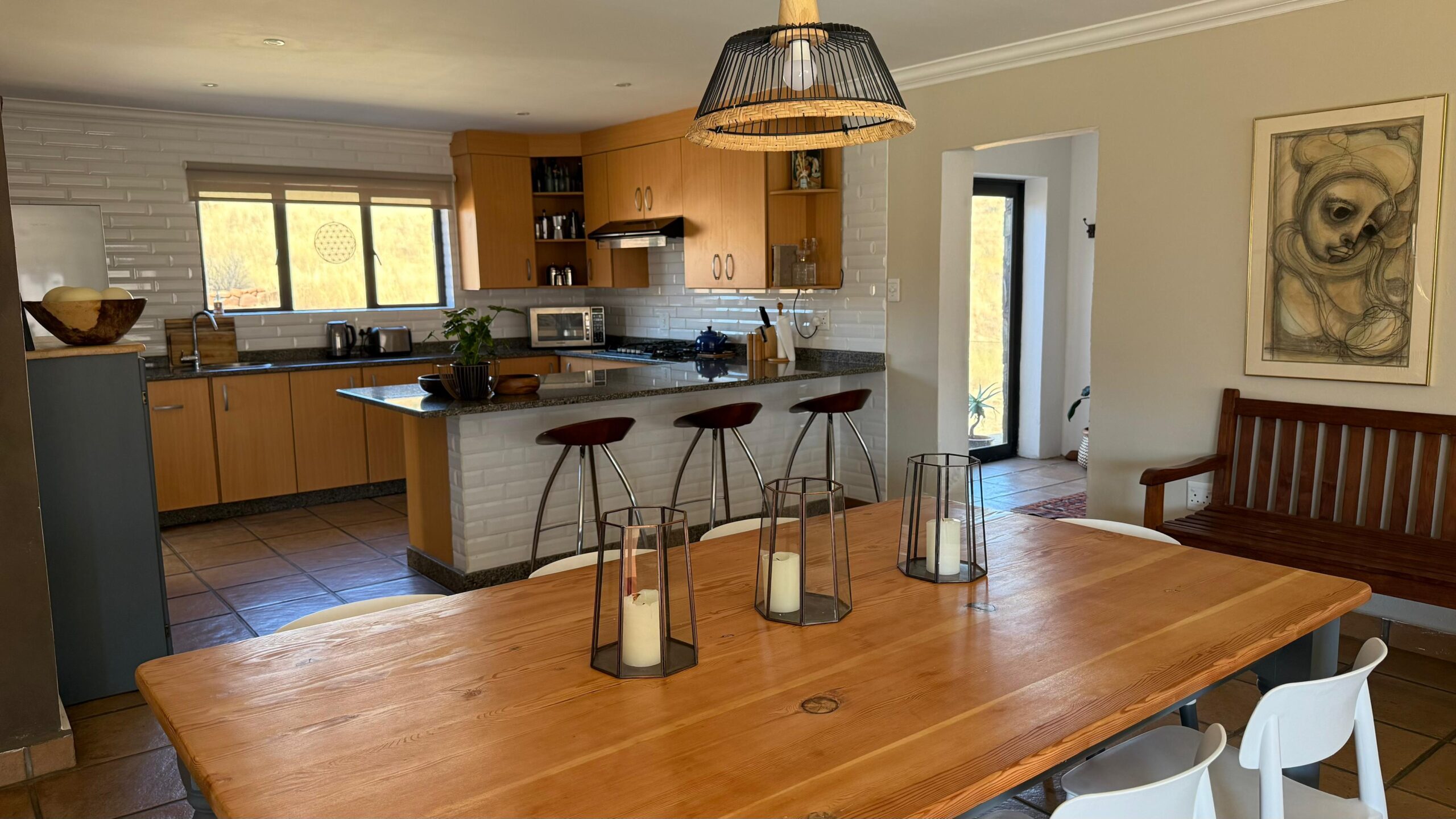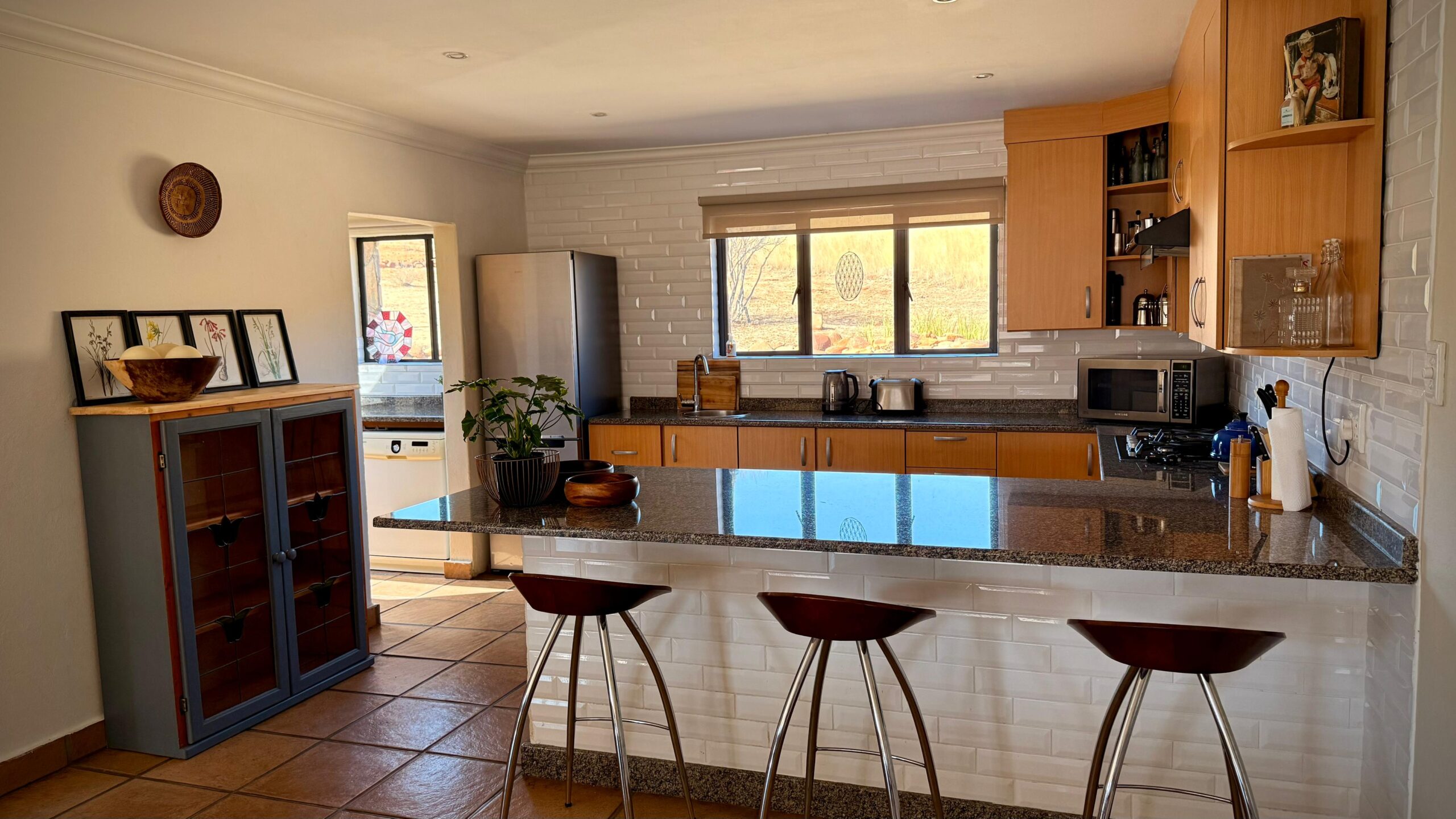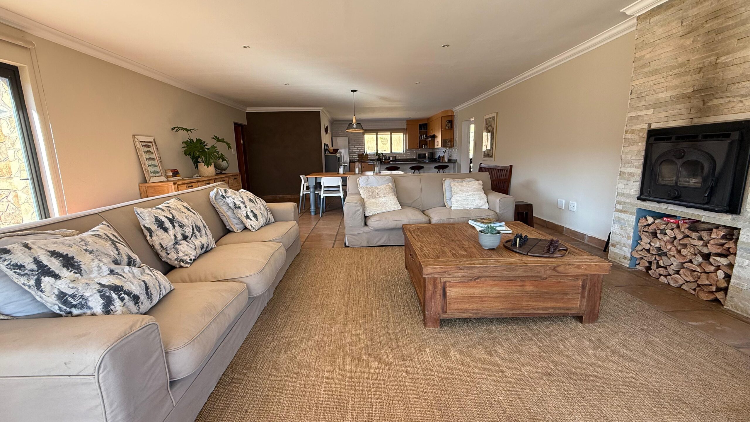 A covered patio with a braai area provides the perfect setting for outdoor meals and relaxation, while a cosy nook at the back of the house is ideal for enjoying afternoon tea. The fire pit overlooking the river creates a memorable atmosphere for evening bonfires. The house is pet-friendly and will soon be equipped with solar power for sustainable living.