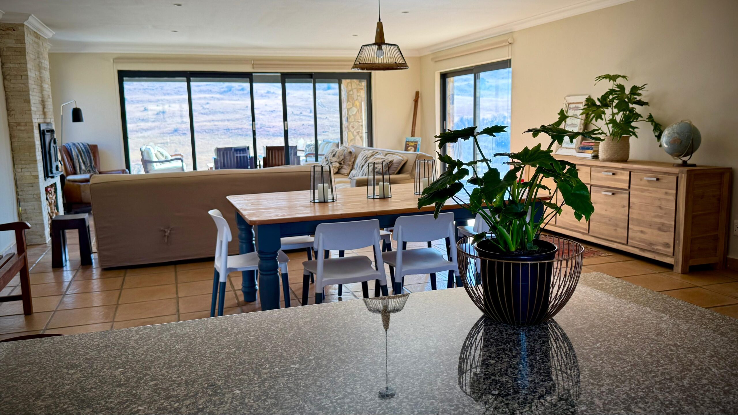 The main house at Riverbend on Komati offers a comfortable and well-equipped space for guests. It includes two full bathrooms, ensuring convenience for all visitors. The kitchen is fully equipped with a six-plate stove, breakfast nook, and scullery, making it ideal for meal preparation and family gatherings. For added comfort, the open-plan dining area flows seamlessly into the lounge, which features a fireplace for cosy evenings.